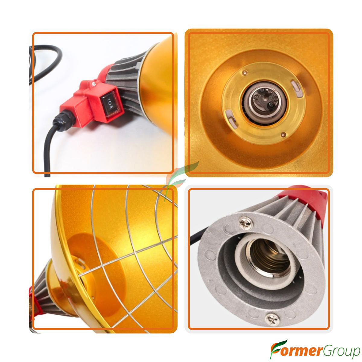 - El diseño incluye un radiador de calor de excelente capacidad de reflexión, lo que garantiza una distribución uniforme del calor hacia el área deseada. Además, su estructura metálica resistente al calor y a condiciones exigentes asegura una larga vida útil, incluso en ambientes con alta humedad y polvo.